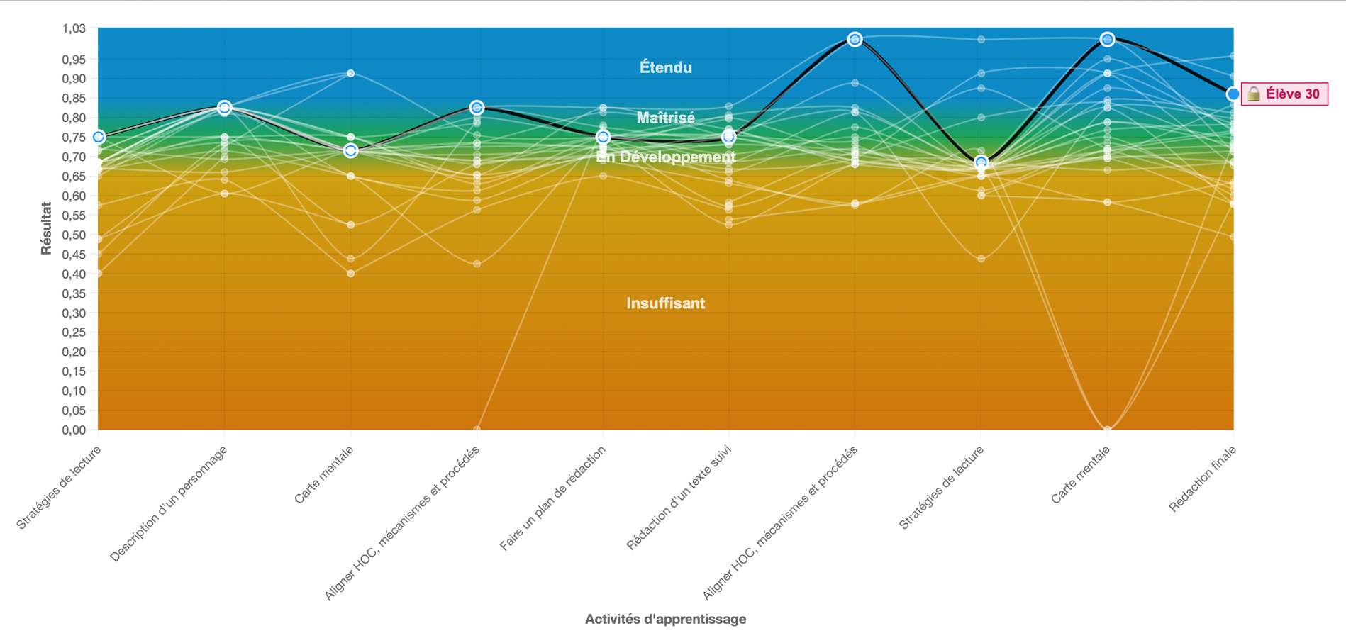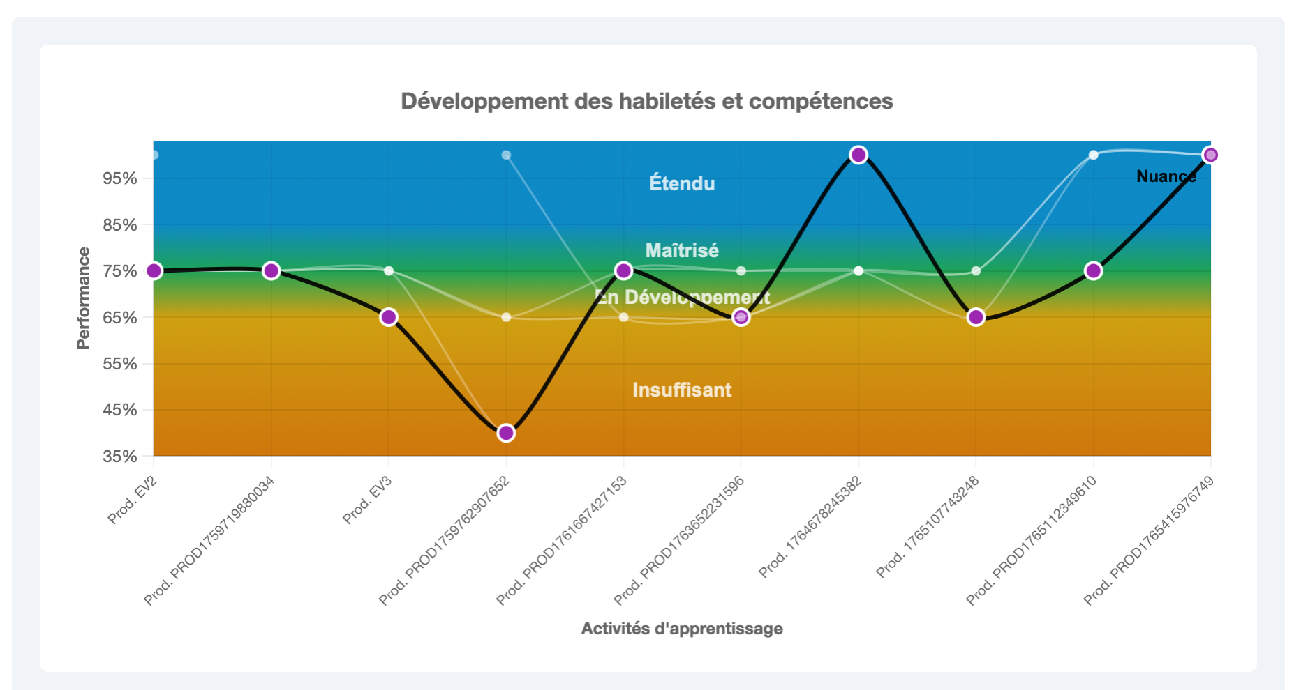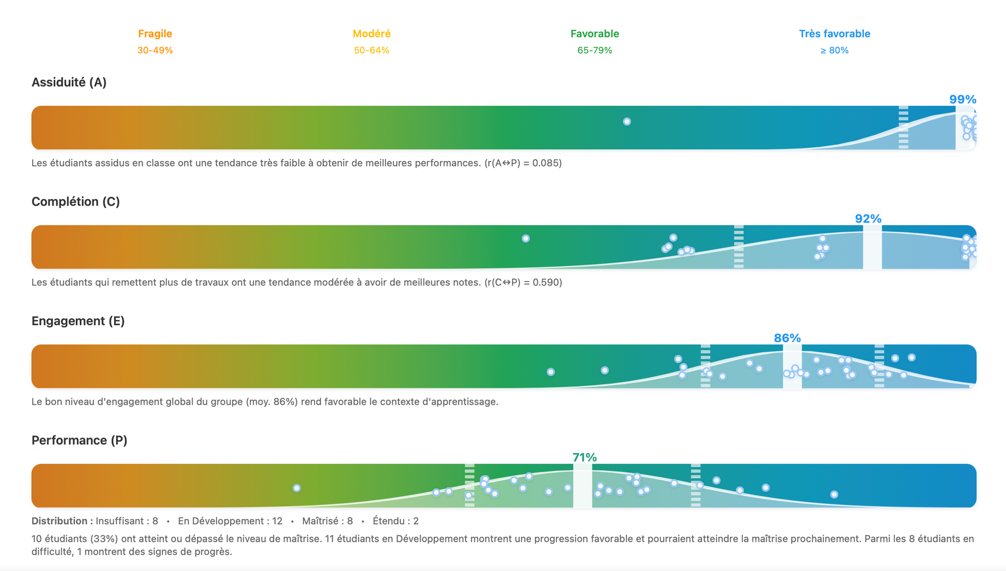 L'application que j'ai développée est née du besoin d'observer et de comprendre la dynamique en classe. Elle capte des micro-données – présences, travaux remis, évaluations critériées selon des niveaux de performance, rétroactions – et les transforme en représentations visuelles interprétables : des trajectoires d'apprentissage, des indices de dépistage, des corrélations entre des conditions et des résultats.