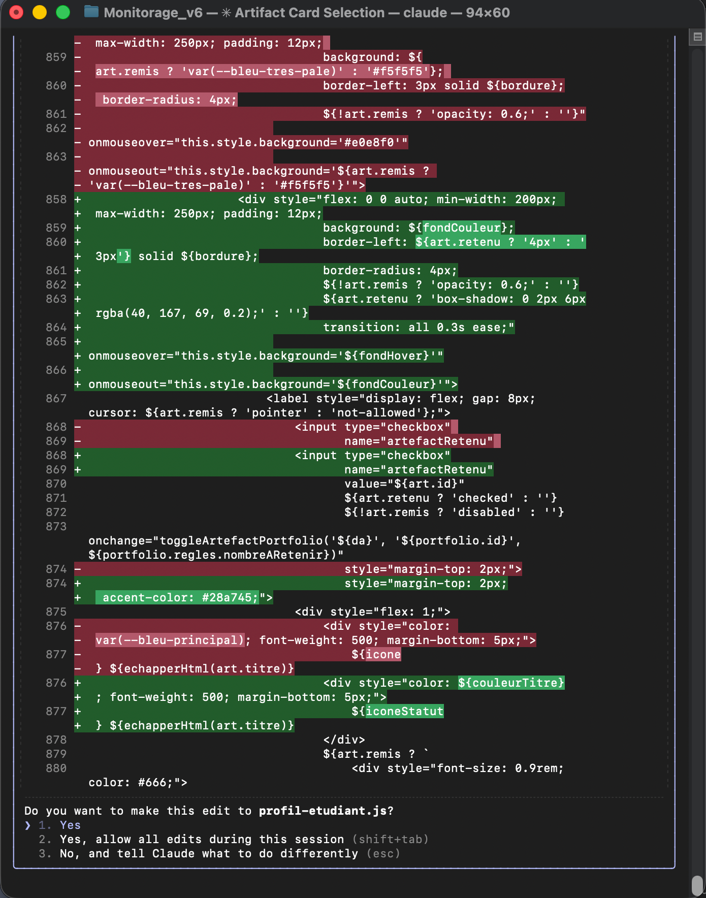 Mon expérience se résumait à quelques lignes de BASIC écrites au secondaire dans la classe d'informatique de monsieur Lafrenière. J'avais certes construit quelques sites web rudimentaires vers 2000-2005. Mais je ne maîtrisais ni JavaScript, ni HTML. Pourtant, j'avais une vision claire : transformer mon système artisanal de suivi des apprentissages en outil utilisable et partageable. Travailler avec l'IA a exigé que je transforme mon savoir tacite en «instructions» explicites. Et c'est là le coeur de mon apprentissage.